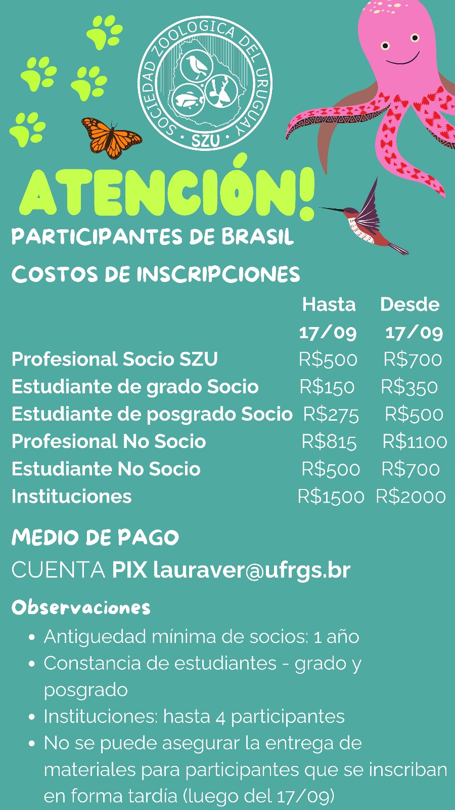 Todas as informações atualizadas sobre o VIIICUZ estão sendo compartilhadas através do site https://cuz.szu.org.uy e as inscrições dos participantes brasileiros e associados da SBH podem ser feitas com pagamento pelo pix: lauraver@ufrgs.br, nos valores conforme figura abaixo. Além do site, circular anexa aqui também traz informações.